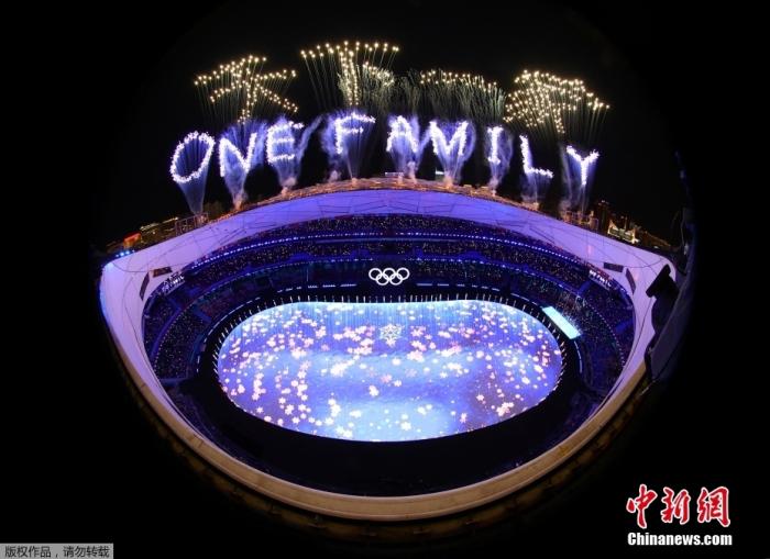 2月20日,北京2022年冬奥会闭幕式尾声烟花秀:天下一家。