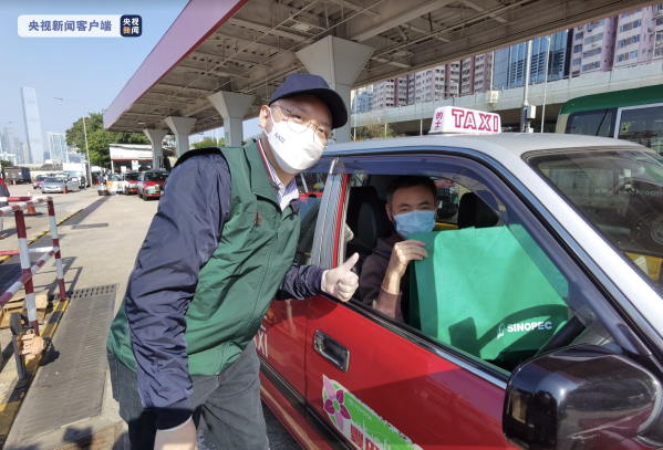 连日来,香港工联会理事长黄国和中国石化抗疫义工队在香港多个加气站向香港巴士、的士司机派发防疫药包。