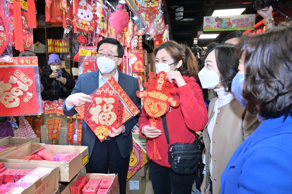 “出入平安好,平安是福。”1月20日是农历腊月二十九,在香港青衣长亨街市的一家挥春店,香港特区行政长官李家超举着一张带有“出入平安”字样的“福”字对店主宋小姐说。