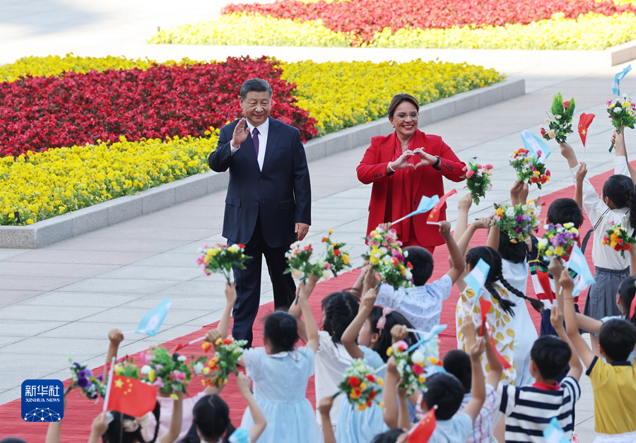 6月12日下午,国家主席习近平在北京人民大会堂同来华进行国事访问的洪都拉斯总统卡斯特罗举行会谈。这是会谈前,习近平在人民大会堂东门外广场为卡斯特罗举行欢迎仪式。(新华社记者 王晔 摄)