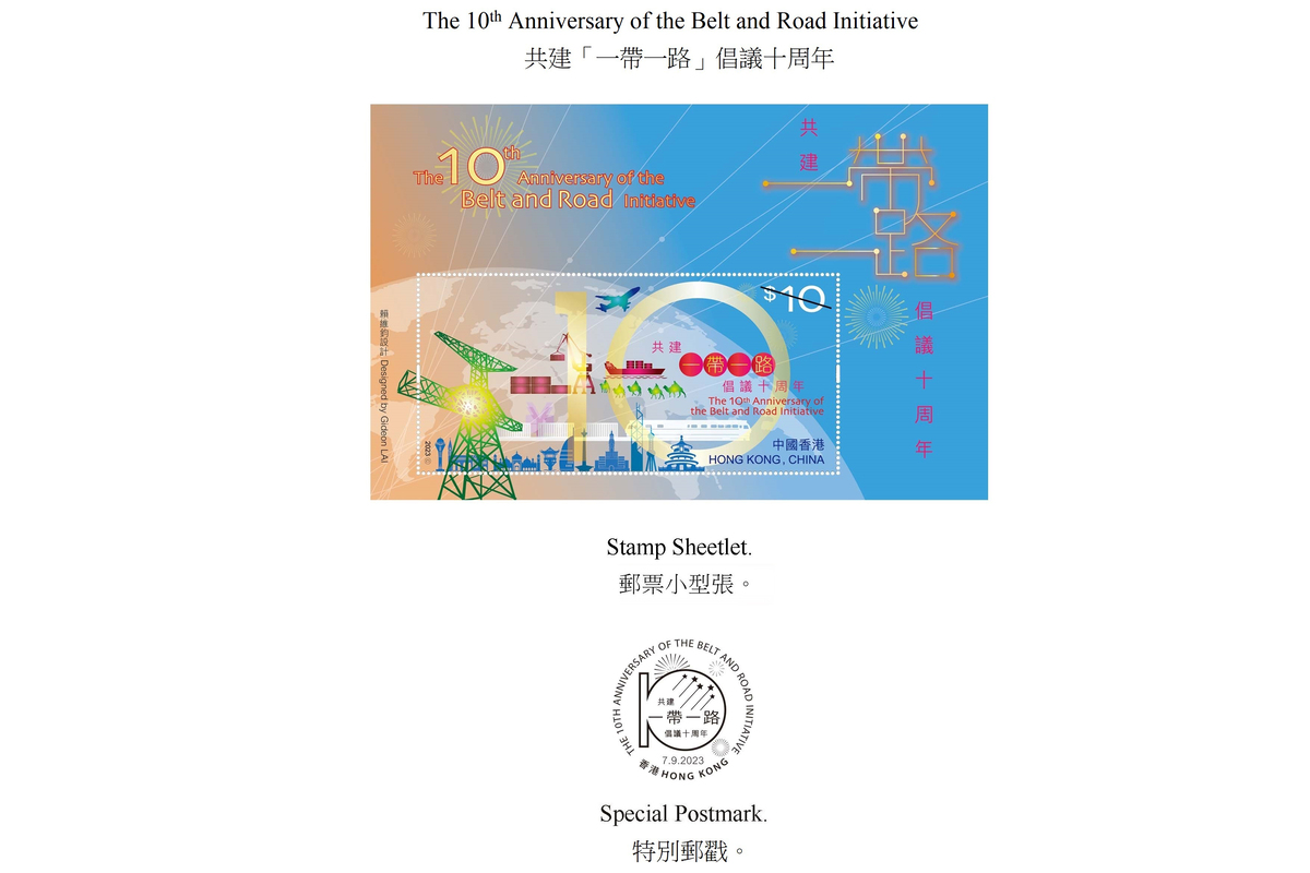 共建“一带一路”倡议十周年纪念邮票小型张9月7日发行。各邮政局同日为所有正式首日封、纪念封、注明首日字样和本地地址的自制封提供实时人手盖印服务。(图片来源:香港特区政府新闻网)