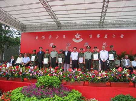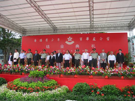 本网讯 7月26日上午,由群力资源中心、中国人民解放军驻香港部队和特区政府教育局合办的第五届“香港青少年军事夏令营”结业典礼在驻港部队新围军营隆重举行。全国政协副主席董建华、香港青少年军事夏令营发起人兼名誉主席董赵洪娉、中联办主任彭清华、驻港部队司令员张仕波、驻港部队政委刘良凯、外交部驻香港特派员公署副特派员高玉琛、香港特区政府教育局局长孙明扬、保安局局长李少光、民政事务局局长曾德成以及中联办青年部负责人出席了结业典礼。 来自全港120间中学的200名中三至中六学生参加了本次夏令营。他们在驻港部队经过为期半个月的军营生活和国民教育,学习了军队的基本知识和光荣传统,加强了纪律观念和团结意识,磨练了刻苦耐劳的意志品质,增强了国家观念和民族意识。