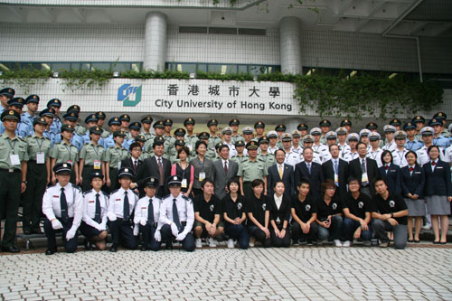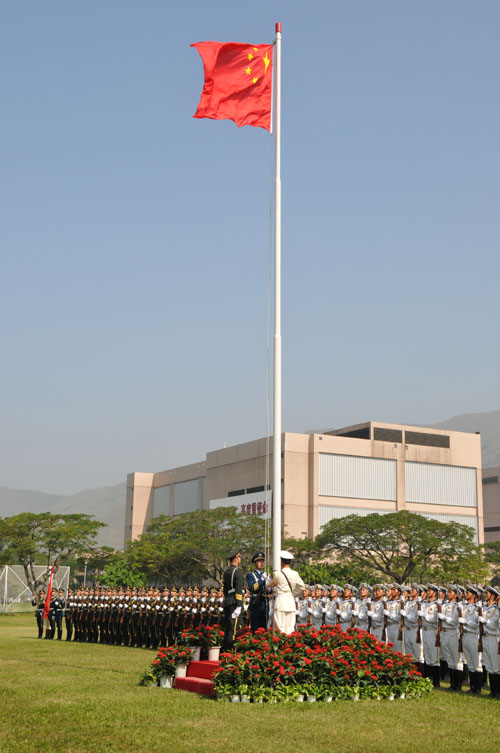 城市大学学生升旗队举行升国旗仪式 师生与官兵合影留念 官兵参观城市大学实验室 学生与官兵在餐桌上亲切交谈 隆重的升旗仪式