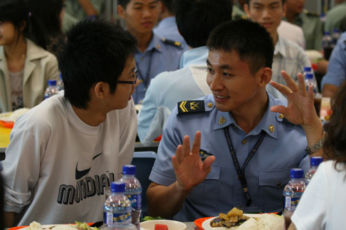本网讯 2009年度驻港部队与香港大学生互访联谊活动于10月16日至17日分别在城市大学和驻港部队石岗军营举行。 10月16日,驻港部队80名官兵在副政委曾庆年少将的带领下到访城市大学,城市大学校长、副校长和学生会会长等热情接待了来访官兵。我办副主任王志民、青年部部长韩淑霞、副部长李蓟贻等出席了活动。活动在城市大学学生会国事会举行的升国旗仪式中拉开帷幕。城市大学校长郭位教授首先对驻港部队的到访表示欢迎,并热情赞颂驻港部队为维护香港安定繁荣所做的贡献。城市大学学生会会长李安然热情拥抱曾庆年少将,亲切称呼官兵为“兵哥哥”、“兵妹妹”,并表示“解放军保家卫国,照顾香港人的安全,好比兄弟姐妹”。曾庆年少将感谢城大师生的热情接待,表示访问活动将促进驻港部队官兵与市民特别是大学生的情谊,很有意义。官兵在师生引领下参观教学、科研、生活设施,共同聆听教授讲课,在学生食堂共进午餐,体验大学生活,近距离交流沟通,联络感情。官兵与师生还进行了精彩的乒乓球友谊赛,曾庆年少将亲自上场,为比赛添彩。 10月17日,香港12所高校的300多名大学生以及各界嘉宾和驻港部队官兵共800多人参加在驻港部队石岗军营举行的“大学生进军营”活动。我办副主任王志民、青年部部长韩淑霞、副部长李蓟贻以及特区政府有关司局官员、高校校长、学生事务处负责人、学生会领袖、青年社团领袖等出席了活动。曾庆年少将对师生到军营参加活动表示欢迎,表示将通过各种活动为大学生了解国防提供帮助。珠海学院校长张忠柟教授代表各高校热情赞颂驻港部队威武文明之师的精神风貌,认为官兵们表现出的爱国情操值得大学生学习。香港大学三年级学生关沛浚代表学生感谢驻港部队为大学生了解国防提供的宝贵机会,表示将学习军人精忠报国的优良品质,好好装备自己,推动国家繁荣富强。驻港部队为大学生献上了精彩的军乐队列、枪械团体操等军事科目表演,并出动直升机和特战队进行了反恐作战行动演练,震撼了全场师生。大学生在官兵引领下亲密接触各种先进武器装备,参观官兵生活和娱乐设施,听国防知识讲座,并与官兵一起吃饭,一起赛球,体验军营生活。驻港部队仪仗队官兵还首次与大学生合影留念并互动交流,给大学生留下了难忘的记忆。活动在驻港部队军乐队演奏的《友谊地久天长》中圆满结束,师生与官兵恋恋不舍,依依惜别。