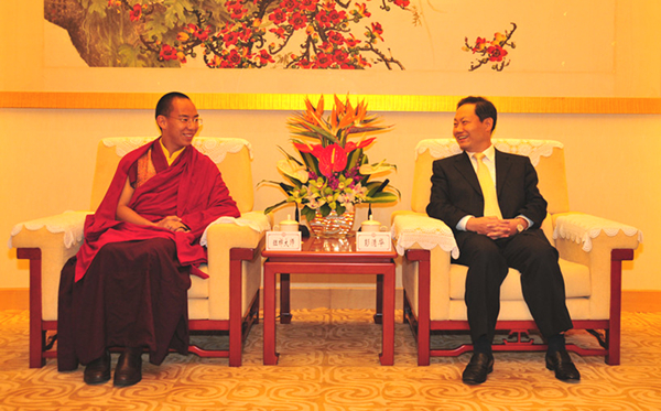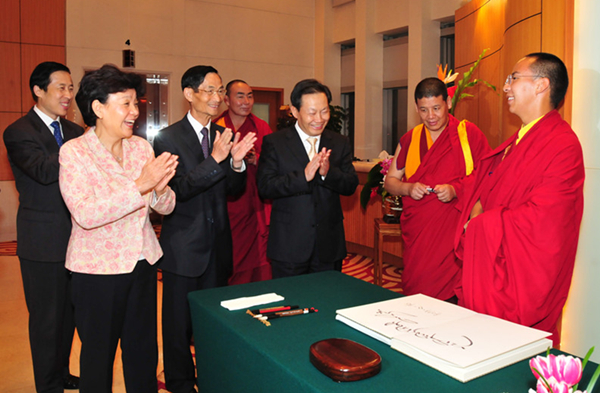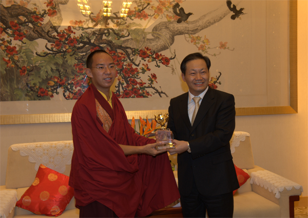 第十一世班禅额尔德尼•确吉杰布向中联办主任彭清华敬献哈达并回赠纪念品