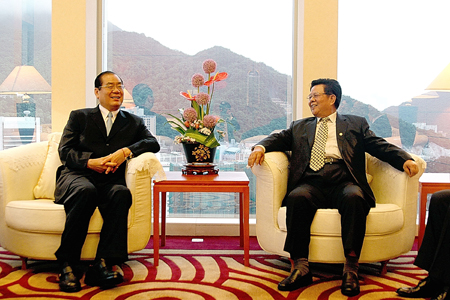 本网讯 6月18日,中央政府驻港联络办副主任周俊明会见并宴请了来港访问的中国国民党副主席曾永权一行。曾永权今年3月20日当选台湾中华港澳之友协会会长;此次应香港智经研究中心、香港理工大学联合邀请,于6月17日至18日对香港进行为期两天的访问。随同曾永权访港的有曾永权办公室主任谢文煌、中华港澳之友协会秘书长张仕贤等。