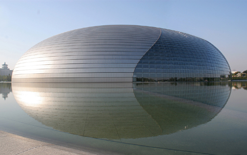 国家大剧院位于北京市中心天安门广场西,人民大会堂西侧,西长安街以南,由国家大剧院主体建筑及南北两侧的水下长廊、地下停车场、人工湖、绿地组成,总占地面积11.89万平方米,总建筑面积约16.5万平方米。国家大剧院工程于2001年12月13日开工,2007年9月建成,由法国建筑师保罗·安德鲁主持设计,设计方为法国巴黎机场公司。国家大剧院建筑屋面呈半椭圆形,由具有柔和的色调和光泽的钛金属覆盖,前后两侧有两个类似三角形的玻璃幕墙切面,整个建筑漂浮于人造水面之上,行人需从一条80米长的水下通道进入演出大厅。大剧院造型新颖、前卫,构思独特,是传统与现代、浪漫与现实的结合。