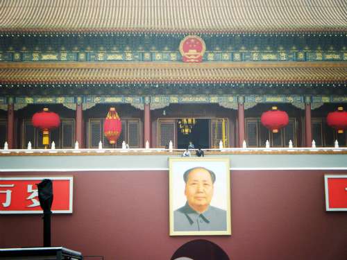 图:九月三十日上午十一时许,天安门城楼上,七盏大红色灯笼高高挂起,尚有一盏等待悬挂,工作人员正在最后调试毛主席画像的位置(本报记者张靖唯摄)