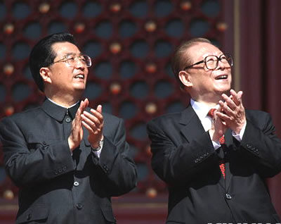 胡锦涛、江泽民在天安门城楼上。