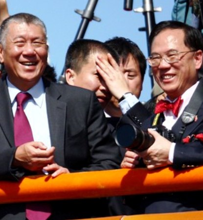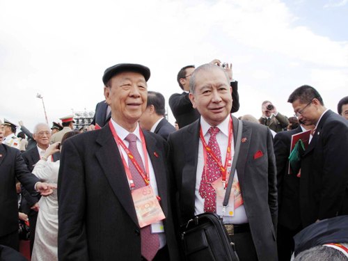 东亚银行主席李国宝(右)与李志和在观礼台上。(图片来源:香港中通社)