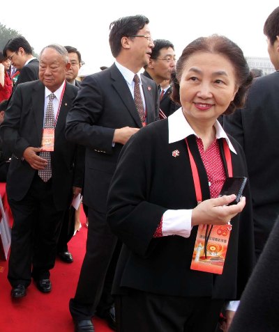 梁爱诗(前)等在观礼台上。(图片来源:香港中通社)