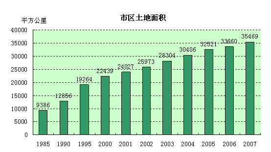 新中国成立60年来,随着城市数量增多和城市人口数量增长,城市规模也在不断扩大。1985年,我国城市市区面积仅为9386平方公里,到2007年城市市区建筑区土地面积已达到3.5万平方公里,22年间增加2.78倍。
