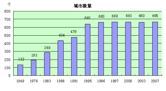 1949年,我国仅有城市132个,截至2007年末我国的城市数量已达655个,比1949年增加523个。新中国成立以来,我国城市数量发展的变化大致可分为四个阶段:一是缓慢发展阶段(1949-1978年),1978年末我国城市数量由1949年的132个增加到193个;二是较快发展阶段(1978-1983年),1983年末我国城市数量由1978年的193个上升到289个,比1978年增加96个,增长49.7%,平均每年增加16个城市;三是快速增长阶段(1984-1991年),1991年末我国共有城市479个,比1983年增加190个,增长65.7%,平均每年增加23个;四是平稳发展阶段(1992-2007年),到2007年末我国城市数量比1992年增加176个,增长36.7%,平均每年增加11个。