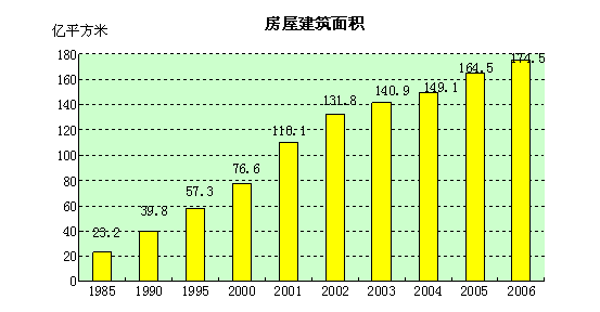 在计划经济年代,我国城镇居民的住房主要是租赁单位或房管部门的房屋,只有少数居民拥有自己的住房,广大居民虽有房住,但是面积小、条件差、无产权,住房需求受到抑制。自1998年起,我国实行住房制度改革,国有单位全部停止实物分房,实现住房货币化分配,房屋成为家庭财产的重要组成部分。住房制度的改革,催生了住宅建设这一新的经济增长点。城市的房屋建设面积发生巨大变化,1985年我国房屋建筑面积为23.2亿平方米,至2006年已达到174.5亿平方米,22年间增长6.52倍。城镇居民人均住宅建筑面积也由1978年的6.7平方米增加到27.1平方米,增长3.04倍。