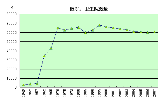 新中国成立60年来,我国城市公共卫生服务网络逐步形成,城镇居民医疗保险制度逐步完善,社区医疗网点不断增多,医疗设施和服务水平不断提高。1952年我国医院和卫生院仅有2600个,床位数16万张,卫生技术人员69万;2007年我国拥有医院、卫生院达6.1万个,床位数343.8万张,卫生技术人员478.8万人,与1952年相比分别增长22.3倍、20.5倍和5.9倍。2007年每万人拥有卫生机构床位26.3张,每万人有执业医师15.4人,分别比1978年增长36.2%和42.6%。这表明我国医院服务能力和服务水平一直在不断的改进和提高。