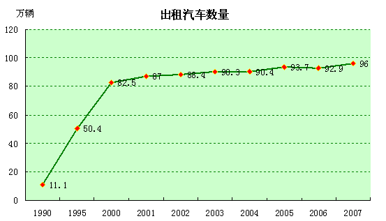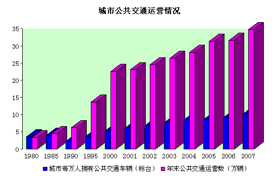 建国60年来,城市交通设施建设取得巨大成就。截至2007年底,全国城市每万人拥有公共交通车辆10.2标台,并且公共交通运营的车辆达34.8万辆,分别比1990年增长4.6倍和3.6倍;2007年末全国城市拥有出租车96万辆,比1990年增长7.6倍;2007年底我国城市居民家庭每百户家庭拥有家用汽车达6.1辆。