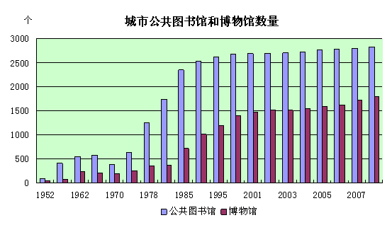 新中国成立60年来,城市市民精神文化生活日益丰富。截至2008年,全国有超过100个城市开展有线数字电视业务,用户突破4000万户;广播节目和电视节目的综合人口覆盖率均已达到96%以上。2008年我国地级及以上城市(不包括市辖县)拥有公共图书馆2825个,博物馆1798个,文化馆3171个,体育场(馆)3.3万个。一批大型文化体育设施相继建成开放,极大地满足了居民文化娱乐和体育健身需求。亚运会和奥运会等世界级体育盛会先后在我国成功举办,促进了各个层次的体育竞技、交流活动的开展,提升了市民的身体素质。社会全民健身工程和基层文化设施的广泛普及,城市整体环境的持续改善,使市民的文化娱乐生活更加丰富多彩。