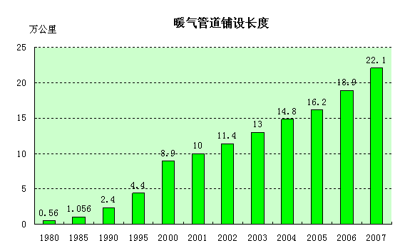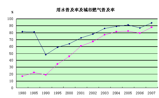 在城市居民的住房条件不断提高的同时,居民的生活条件也在发生着翻天覆地的变化。截至2007年底,全国地级及以上城市(不包括市辖县)供水总量达501.9亿立方米,供气总量(人工、天然气)达631亿立方米。在城市用水、用气和供热方面均取得巨大成就。城市用水普及率和燃气普及率在1980年分别为81.4%、16.8%,到2007年分别增加到93.8%、87.4%;城市供暖气管道铺设长度由1980年的0.56万公里,增加到2007年的22.1万平方公里,增长38.5倍;城市集中供热面积也由1990年的2.1亿平方米增加到2007年的30.1亿平方米,增长13.3倍。建国60年来,城市居民的生活条件有了极大改善,广大城市居民已经普遍进入舒适的小康生活阶段。