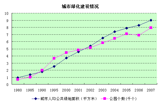 建国60年来,我国城市绿化和环保工作取得了重大成就。截至2007年我国城市拥有公园7913个,人均公园绿地8.98平方米。分别比1980年增长11倍和9倍。城市园林绿地面积170.9万公顷,建成区绿化覆盖率35.3%。截至2007年全国已经有89个城市被住房和城乡建设部授予“国家园林城市”称号。