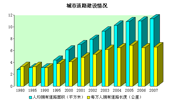 建国以来尤其是改革开放以来,城市道路和公共交通建设工作得到全社会的关注和重视,城市交通规划、建设、管理的水平不断提高。城市交通基础设施得到较大改善,城市交通功能不断提升。随着公交优先发展战略在全国范围内的大力实施,已有230多个城市开辟了公交专用道(路),总长度达2357公里。2007年全国城市道路面积42.36亿平方米,比1978年增长16倍;人均拥有道路面积11.4平方米,比1980年增长3.1倍;每万人拥有道路长度为6.6公里,比1980年增长1倍。
