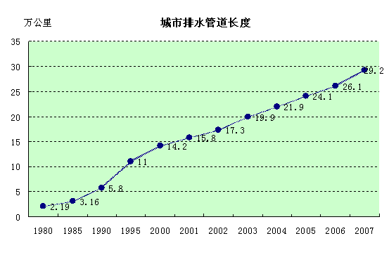 随着人们环保意识的增强,科学发展观的深入人心,城市环境管理与综合整治工作取得了较大的进展和成就。截至2007年,全国建成城市污水处理厂883座,污水日处理能力7137万立方米,分别比1978年增长25倍和106倍;城市污水年处理总量达227亿立方米,城市污水处理率62.8%;排水管道长度29.2万公里,比1978年增加近14倍;公共厕所11.3万座,市容环卫专用车辆7.2万辆,分别比1978年增长1.1倍和12.6倍。