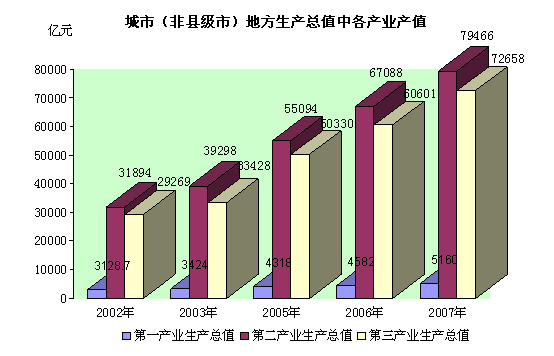 2007年我国地级以上城市(不包括市辖县)地方生产总值中第一、二、三产业增加值分别为5160亿元、79466亿元和72658亿元,第一、二、三产业增加值的结构比重为3.3:50.5:46.2,与1990年相比,第一产业的比重下降3.3个百分点,第二产业的比重下降9.9个百分点,第三产业比重上升13.2个百分点。城市经济在快速发展的同时,经济结构不断得到改善和优化。