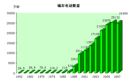 建国60年来,城市通信服务设施建设取得了巨大成就,服务能力极大提升。1952年城市拥有固定电话户数仅为34.7万户,1978年为119.2万户,1990年突破500万户,2001年突破1亿户,2004年突破2亿户,2006年已突破2.5亿户并继续保持增长趋势。电话(尤其是移动电话)已经走进千家万户,为市民的沟通交流提供了极大的便利。其中住宅电话用户2002年突破1亿户,到2007年全国已有1.7亿家庭拥有固定电话。此外,目前移动通信网络已经覆盖了全国绝大多数的县(市),在城市等重点地区基本实现了全覆盖,在主要交通干线和旅游风景区也基本实现了无缝覆盖,室内覆盖也有了明显的改善,大中城市都基本建立了完善的通信室内覆盖系统。