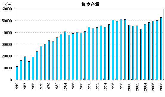 我国创造了用世界10%的耕地养活了世界22%的人口的奇迹。建国初期我国粮食产量处于较低水平,1949年粮食产量仅为11318万吨,2008年达到52850万吨,是1949年的4.67倍。新中国成立60年来,主要粮食产品实现了较大幅度增长。其中,小麦产量从1949年的1381万吨,提高到2008年的11250万吨,增加7.15倍;稻谷从4865万吨提高到19300万吨,增加3倍;玉米从1242万吨提高到16550万吨,增加12.33倍;大豆从509万吨提高到1650万吨,增加2.24倍;茶叶从41050吨提高到124万吨,增加29.21倍;油料从287万吨提高到2950万吨,增加9.28倍。