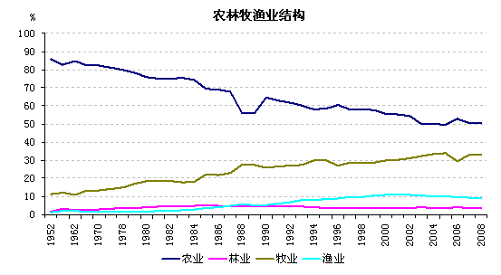 农林牧渔的结构不断优化。建国以来,在农林牧渔业产值获得增长的同时,其结构也在不断优化。从农林牧渔业产值的比重来看,农业产值的比重不断下降,从1952年85.9%下降到2007年的50.4%,下降35.5个百分点;林业产值比重从1952年的1.58%上升到2007年的3.81%,上升2.23个百分点;牧业比重从1952年11.2%上升到2007年的32.98%,上升21.78个百分点;渔业产值比重从1952年1.31%上升到2007年的9.12%,上升7.81个百分点。