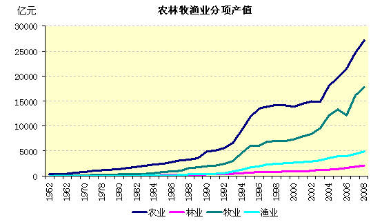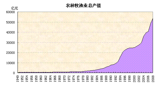 建国初期我国农林牧渔业总产值处于较低水平,1949年农业生产总值仅为326亿元,2008年达到34000亿元,是1952年的104倍。但各个历史阶段的发展是不均衡的,农林牧渔业总产值的增长在改革开放以后呈现出比较明显的增长,主要是1978年后农村推行家庭联产承包责任制,极大地调动了广大农民的生产积极性。