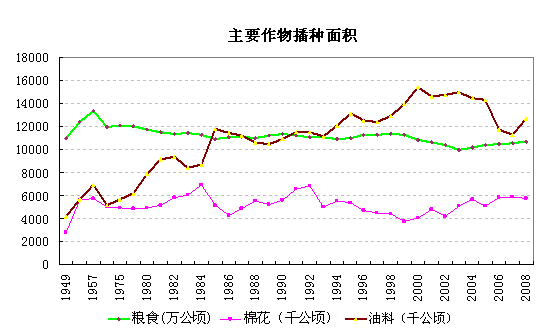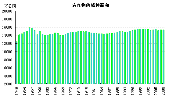 建国以来,我国农作物总播种面积有一定程度的波动。1957年农作物总播种面积为15724.4万公顷,是建国以来播种面积最多的一年。播种面积最少的1949年,为12428.6万公顷。农作物播种面积在上世纪60~70年代间稳步增加,从1962年14029.9万公顷增加到1978年14847.7万公顷。但从1979年到1985年播种面积逐年减少,1985年下降到14362.6万公顷。自1985年到2008年进入波动期,但农作物播种面积始终保持在1.48亿公顷到1.56亿公顷之间。目前农作物的播种面积较建国初期有所增加,但仍未达到历史最高水平。