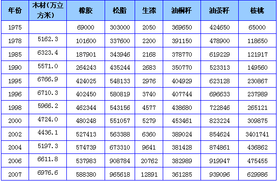 “十五”期间党中央、国务院做出《关于加快林业发展的决定》,确立了以生态建设为主的林业发展战略,实施了天然林保护、退耕还林等六大林业重点工程,全国造林面积增加,林业产品产量上升。木材的产量从改革开放初的5162.3万立方米,提高到2008年的7894万立方米,增长52.92%;橡胶的产量由1962年的5000吨提高到2007年的588379.7吨,增长116.7倍;生漆由1957年的1753吨提高到2007年13万吨;油茶籽由1952年的24.9万吨提高到2007年的93.9万吨;核桃1957年仅为10.3万吨,提高到2007年的630万吨。