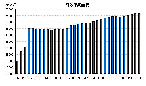 据统计,1952年有效灌溉面积仅为1995.9万公顷,2008年达到5663.6万公顷,是1952年的2.84倍。2007年,我国共有水库85412座,水库总库容6345亿立方米,分别比1990年增加2025座和1685亿立方米;堤防长度增加6.4万公里,堤坊保护面积增加1352万公顷;建设灌区506处,灌区有效灌溉面积新增711万公顷。农田水利建设为农业综合生产能力稳步提高提供了坚实的基础。