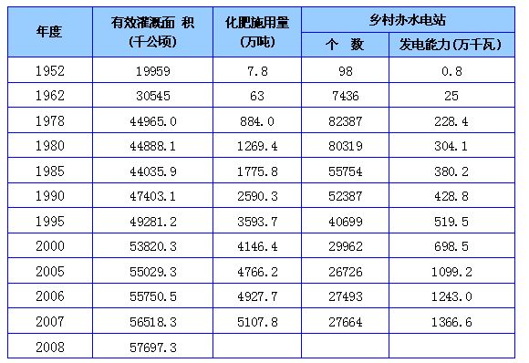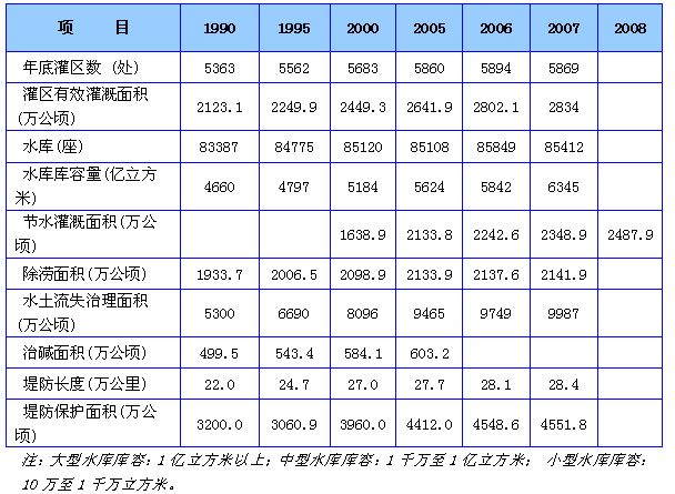 1990年大中型水库的蓄水量为4087亿立方米,2007年增加到5719亿立方米。乡村办水电站的个数由1952年的98个和发电能力0.8万千瓦上升到1978年的82387个和228.4万千瓦,到2007年乡村办水电站的个数虽减少到27664,但是发电能力却上升到1366.6万千瓦。