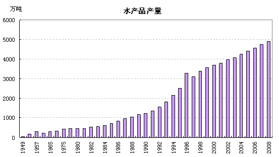 60年来,我国渔业生产力不断提高,生产规模不断扩大,水产品产量大幅度提高。建国初期,水产品的总产量很低,1949年仅为44.8万吨,随着渔业的强劲发展,2008年水产品产量达到4895万吨,较1949年增长100多倍,水产品产量快速增长与我国养殖渔业、捕捞渔业、远航渔业的迅速发展密不可分。