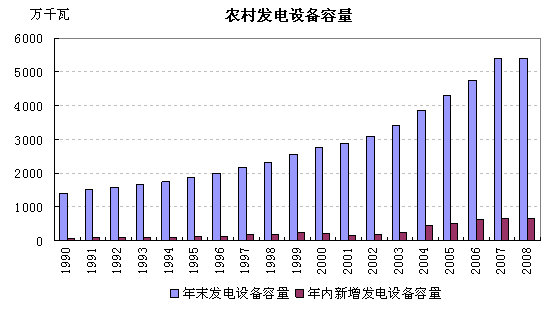 农村水电建设的投资额不断增加,1990年农村水电建设的投资额为34.88亿元,2007年达到511.79亿元。投资使得农村的发电能力增强,1990年的发电设备容量为1397.81万千瓦,2007年发电设备容量上升到5385.56万千瓦。年均新增发电设备容量234.57万千瓦。