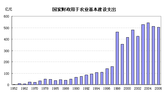 农村电力、水利建设和农业机械化水平的提高有赖于国家财政的大力扶持。国家财政中农业支出额不断增加,1952年农业支出额为5.1亿,占财政支出的比重为5.1%,2006年农业支出额上升到3137亿元,农业支出占财政支出的比重为7.9%。