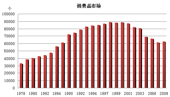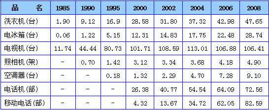 工业类社会消费品供给充足。其中主要消费品产量:轿车由1980年的0.54万辆增加到2008年的503.7万辆;彩电由1978年的0.38万台一举跃为2008年的9033.1万台;移动电话自兴起以来迅速发展到2008年55964万部的产出水平,是2000年的10倍之多。