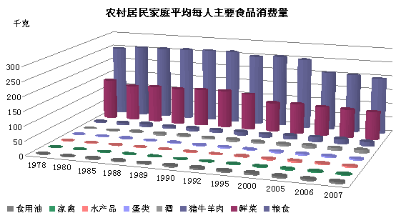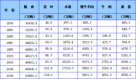社会商品供应量持续扩大。建国以来农业消费品产量显著增长。其中主要的消费品:粮食产量由1949年的11318万吨增加到2008年的52850万吨;水果产量由1978年的657万吨增加到2007年的18136.3万吨;茶叶由1978年的26.8万吨增加到2008年的124万吨,猪牛羊肉2008年产量达7269万吨,牛奶达3651万吨。