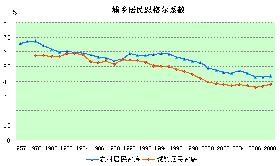 近几年,居民在基本食品、日用品方面的消费比重明显下降,从反映居民家庭食品消费支出占家庭消费总支出比重的恩格尔系数的变动情况就可以看出,城镇居民从1978年的57.5%,下降到2008年的37.9%,农村居民则由1978年的67.7%降为2008年的43.7%