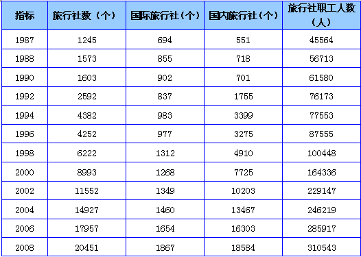 随着我国对外开放程度的提高,来华从事商贸交流活动、旅游观光人数快速攀升。从事旅游业的企业及员工逐年增加,到2007年我国已有旅行社18943个,比1987年增长14.2倍。其中,国内旅行社17146个,增长30.1倍;旅行社从业人员达到30.8万人,增长5.8倍。