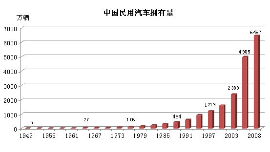 汽车消费成为当今人们投入较多的交通消费,无论城市、农村,对汽车的拥有量均呈快速上升态势。1949年全国民用汽车总计5.09万辆,到2008年增长到6467万辆。其中私有汽车保有量呈现快速增长的态势,家用汽车正成为中等收入户追逐的目标,城镇居民每百户家庭拥有量由1997年的0.2辆增加到6.1辆。