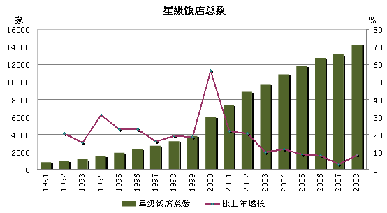 中国酒店业是伴随着我国对外开放,经济发展和人民生活水平提高应运而生,并逐步走上稳步、快速发展的轨道。截至2008年全国已有星级饭店14241个,比1991年增长15.7倍。