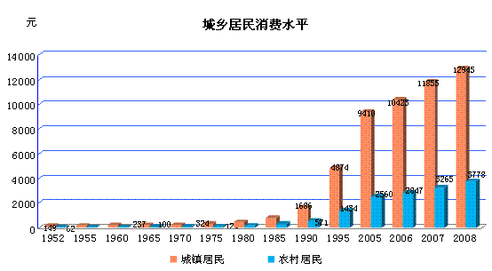 居民的实际消费水平由1952年的每人每年80元,提高到2008年的城镇每人每年12945元,农村每人每年3778元。