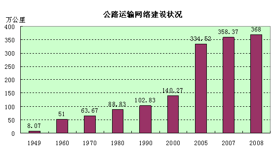 2007年底,中国公路网总里程达到358.37万公里,中国公路(网)的密度达到3733公里/万平方公里,比1978年增加2806公里/万平方公里。等级公路总里程达到253.54万公里,其中,高速公路5.39万公里,遍布全国乡镇的农村公路达到313.44万公里。