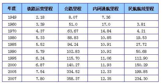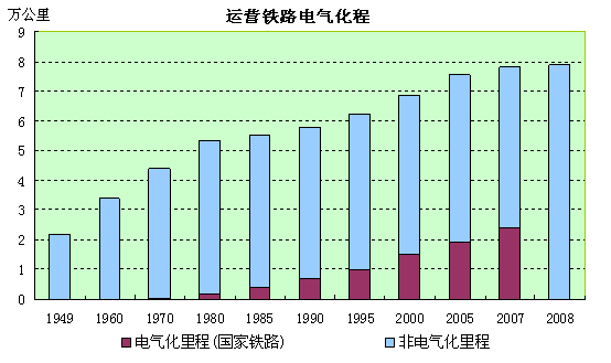 2008年底,中国铁路营业里程达到7.9万公里,居世界第三位。但增长速度低,从1949年底的2.18万公里增加到7.9万公里,共增长2.6倍。铁路网密度由1978年的53.9公里/万平方公里增长到2007年的81.2公里/万平方公里。2007年底,全国已有北京、上海、广州、深圳等10个城市开通运营22条城市轨道交通线路,线路总长超过650公里。
