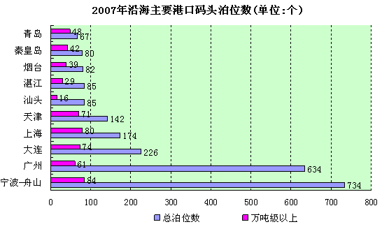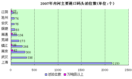 2007年底,中国内河航道通航里程12.35万公里。其中,等级航道6.12万公里。中国港口拥有生产用码头泊位3.5万个,其中万吨级及以上泊位1337个。沿海港口拥有生产用码头泊位4701个,内河港口拥有生产用码头泊位3.12万个。
