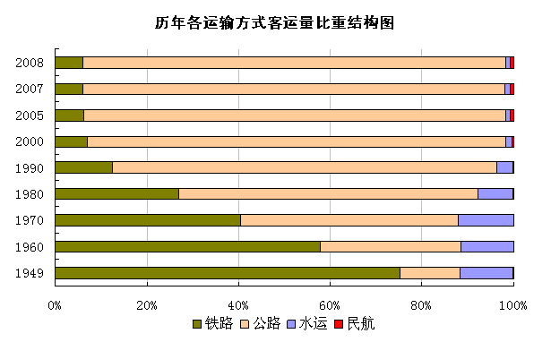 1949年,全国客运量总共为1.37亿人;而2007年,全国共发送客运量222.78亿人,增长161.7倍,其中通过铁路发送13.57亿人,公路发送205.07亿人,水运发送2.28亿人,民航发送1.86亿人。公路仍是我国客运的最主要方式,约占总客运量的92.1%。