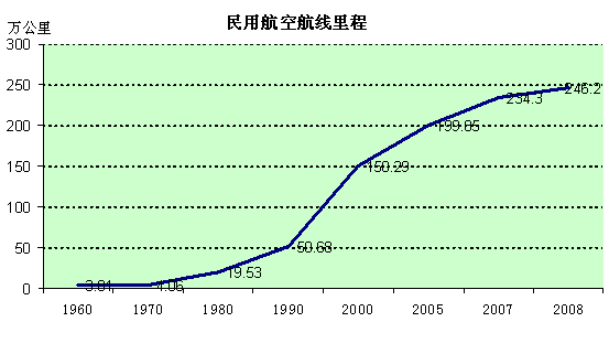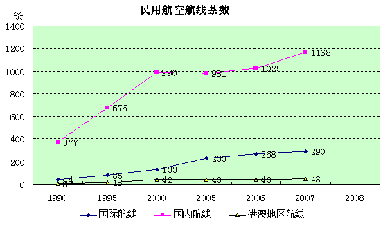 1950年,中国民航仅有航线12条,载运旅客1万人,运输总周转量157万吨公里;2007年底,中国境内民用航空定期航班通航机场为148个,定期航班通航城市146个。全国机场平均密度为每10万平方公里1.53个。