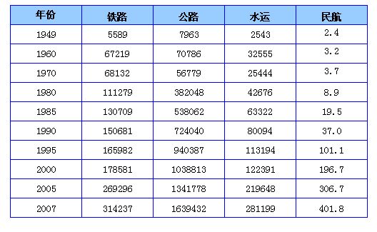 1949年,全国货运量为1.61亿吨;而2007年,全国共发送货运量227.58亿吨,增长140倍,其中通过铁路发送31.42亿吨,公路发送163.94亿吨,水运发送28.12亿吨,民航发送401.8万吨。公路仍是我国货运的最主要方式,约占总货运量的72%。